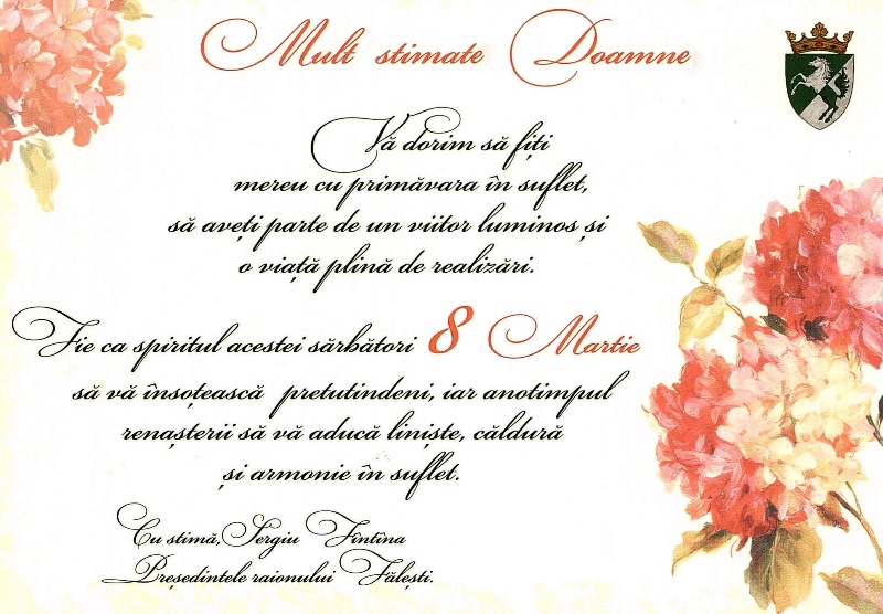 Datorită abnegaţiei şi perseverenţei, prin care Vă manifestaţi în munca cotidiană, aduceţi un amplu aport la sporirea bogăției noastre spirituale, transmiterea din generaţie în generaţie a tezaurului folcloric, muzical - artistic, glorioaselor pagini istorice, la formarea unui vast potenţial spiritual al societăţii, unei ambianţe sociale sănătoase - chezăşie a înţelegerii şi succesului, bunăstării şi prosperităţii.