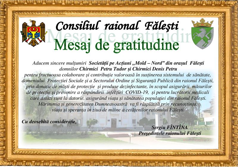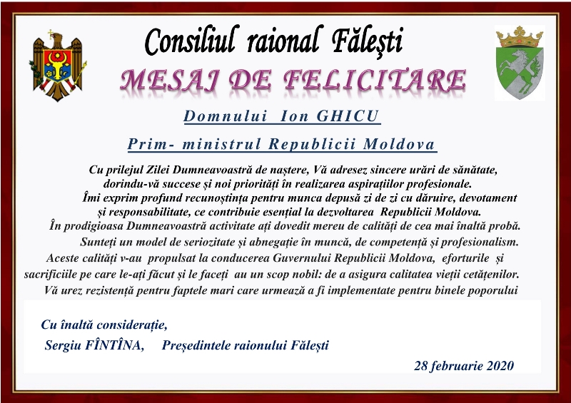 Vă doresc să fiți demni de înalt respect și apreciere pentru munca nobilă pe care o desfășurați întru binele făleștenilor, să Vă înconjoare întotdeauna dragostea apropiaţilor, fidelitatea colegilor şi recunoştinţa cetățenilor.