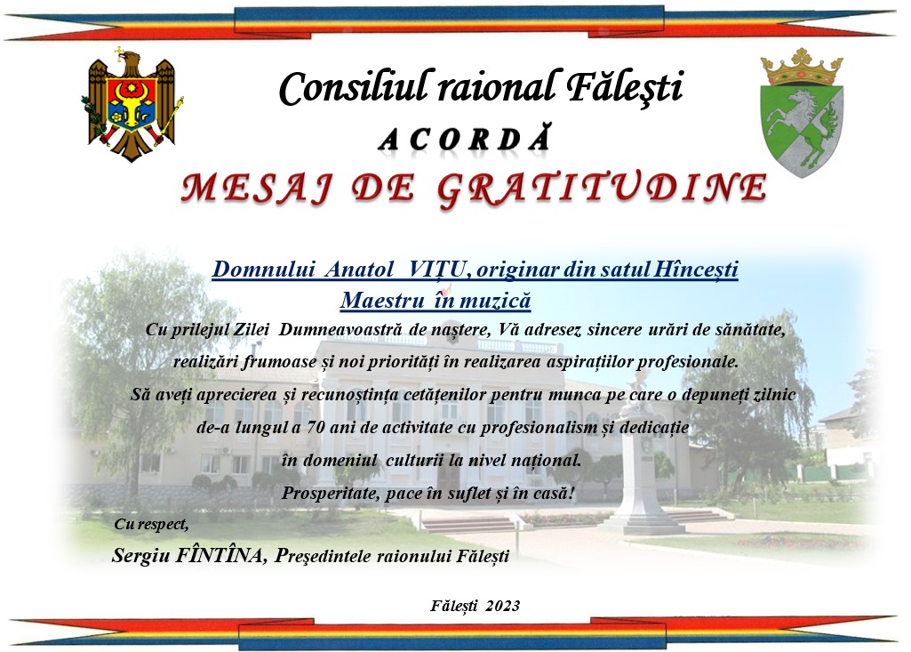 Vă adresez sincere felicitări, însoțite cu expresii de gratitudine, recunoștință și înaltă apreciere a nobilei Dumneavoastră activități desfășurate pe tărâmul educațional.