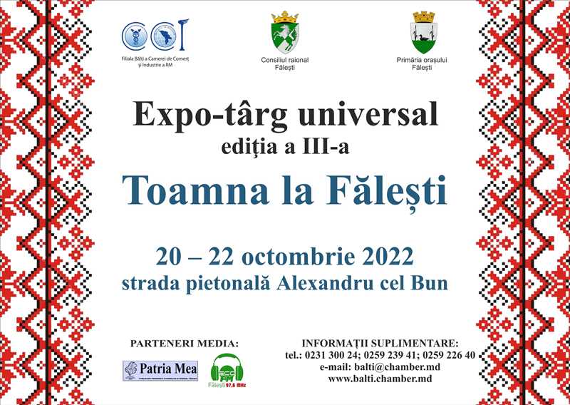 Expo-tîrgul este organizat pe perioada 20-22 octombrie curent de către Camera de Comerţ şi Industrie a Republicii Moldova, filiala Bălţi în parteneriat cu Secția Economie din cadrul Consiliului raional și primăria orașului Fălești.