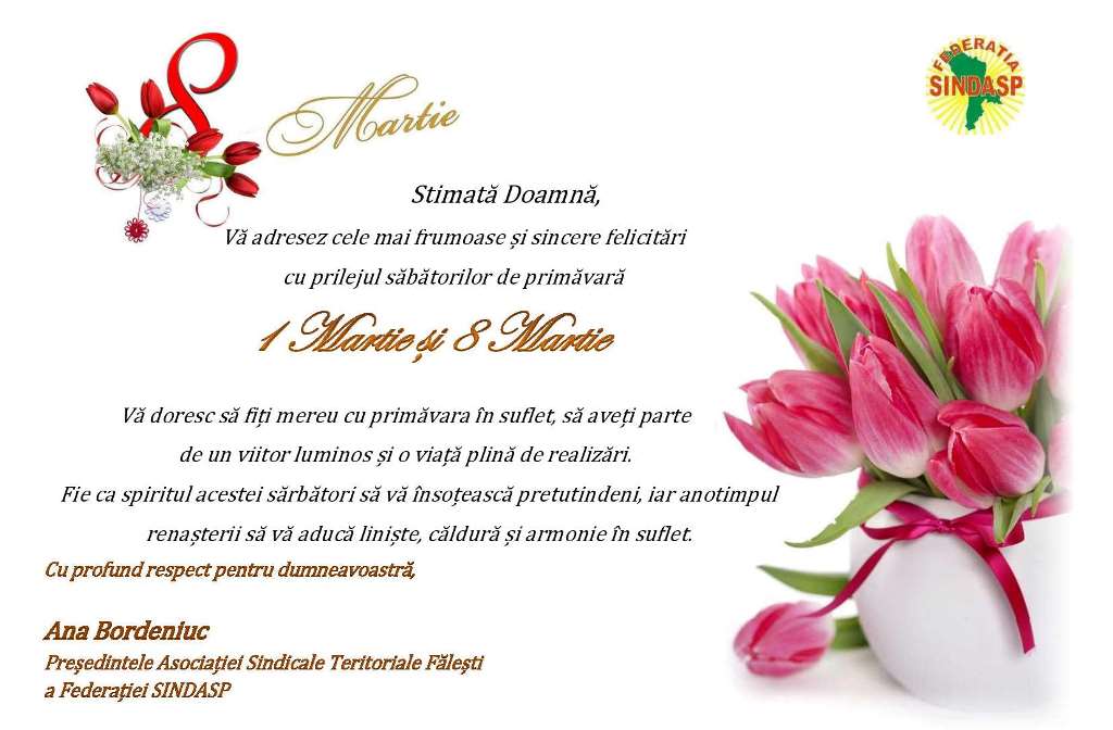 Spre finalul întrunirii, cu prilejul sosirii sărbătorilor de primăvară 1 Martie și 8 Martie, toate doamnele participante la ședință au primit sincere felicitări din partea conducerii raionului a Domnului Veaceslav TAMBUR, Vicepreședintele raionului, Doamnei Liliana MALACHI, șef adjunct al Direcției Asistență Socială, Protecție a Familiei și Copilului și din partea Doamnei Ana BORDENIUC, Președintele Asociației Sindicale Teritoriale SINDASP.