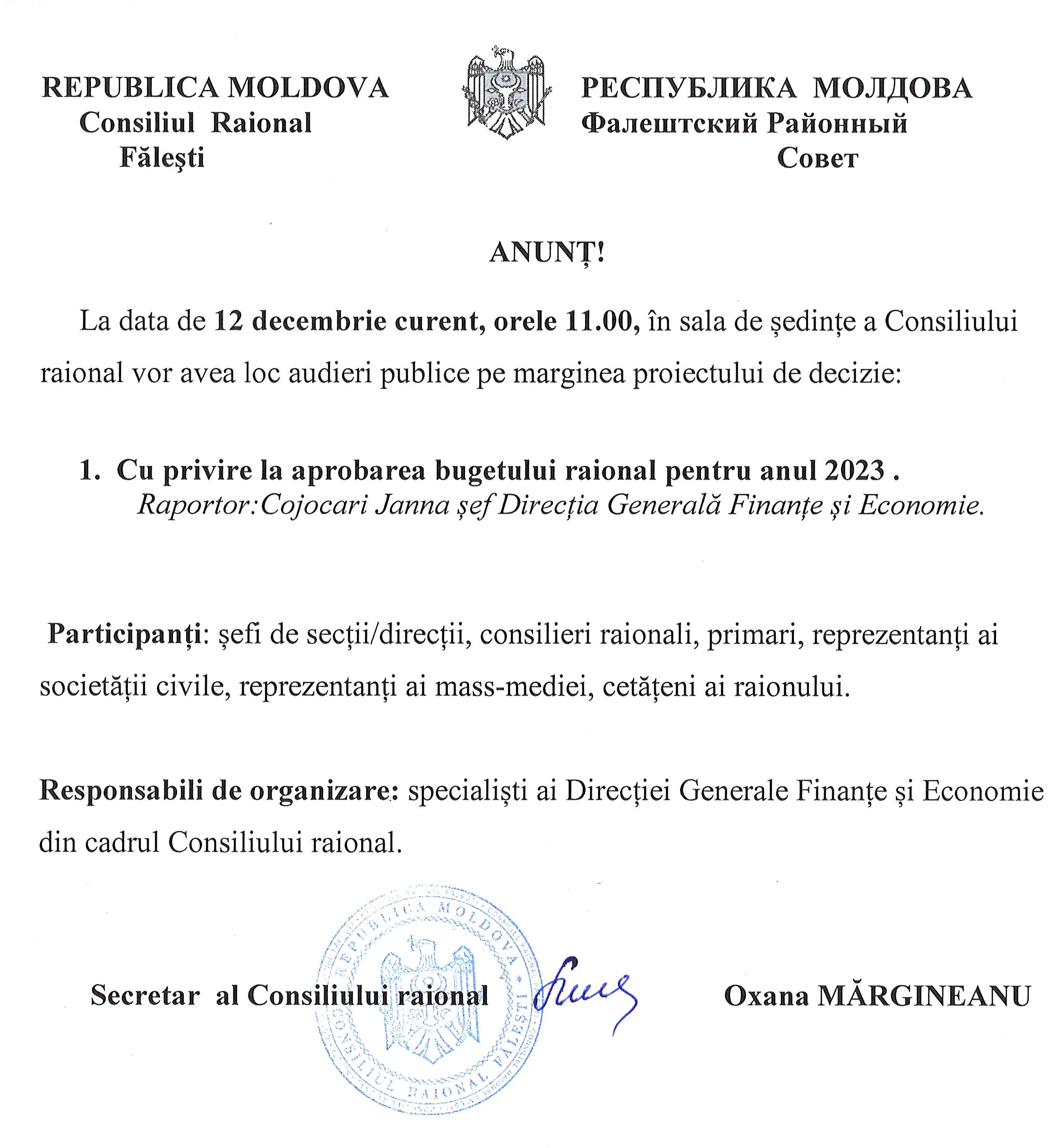 Direcţia Generală Finanţe şi Economie din subordinea Consiliului raional Făleşti anunţa iniţierea elaborării proiectelor de decizie „Cu privire la aprobarea bugetului raional pentru anul 2020, în două lecturi”.