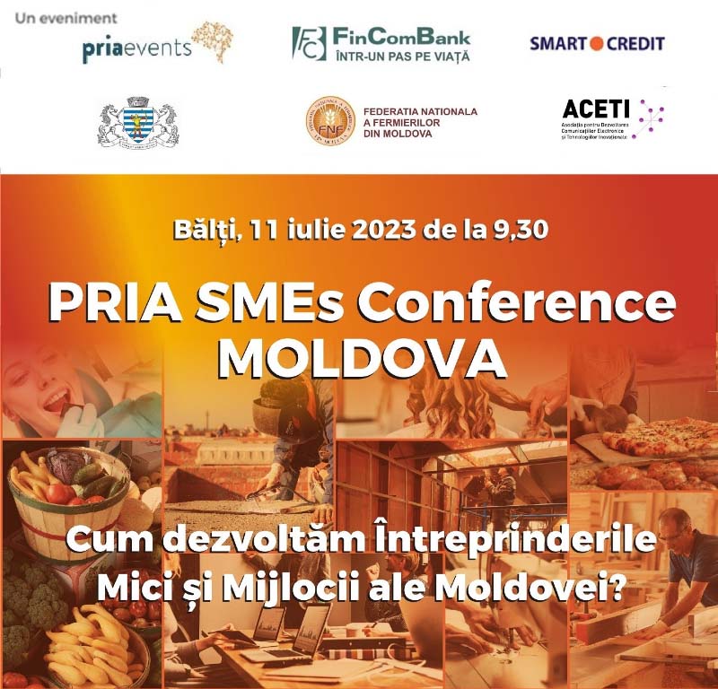 PRIAevents, în parteneriat cu FinComBank , SMART CREDIT, FNF și ACETI vă invită la conferința Pria SMEs Bălți – Cum dezvoltăm Întreprinderile Mici și Mijlocii din Moldova în Bălți, în 11 iulie 2023, de la 9,30.