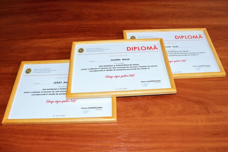 Cu acest prilej Ministerul Sănătății, Muncii și Protecției Sociale al Republicii Moldova pentru contribuție la salvarea de vieți omenești prin donarea voluntară de plasma convalescentă în situația de pandemie provocată de COVID-19 ,,Sânge sigur pentru toți” au fost decernați cu diplome trei cetățeni din raionul Fălești.