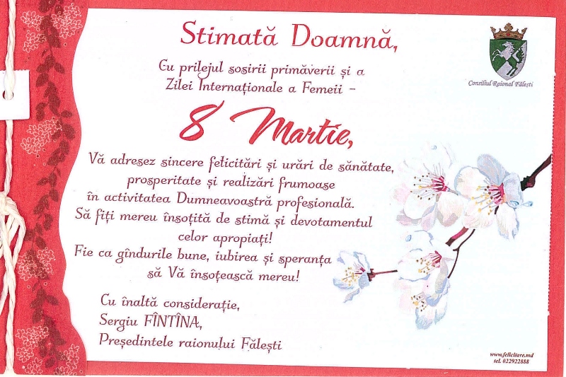 Mesajul pentru stimatele doamne a fost însoțit de cuvinte alese de sănătate, prosperitate și realizări frumoase în activitatea profesională.